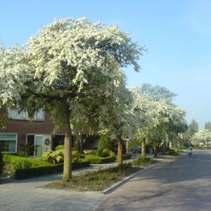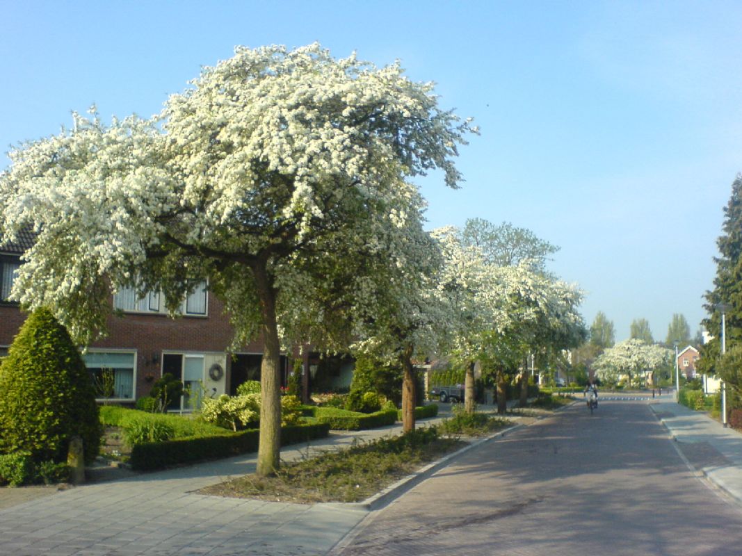 Bijna aan het einde van de rondleiding staan we even stil in het straatje met de rij Malus toringo, die in het voorjaar een mooie witte zee van bloemen is. De buurvrouw die buiten staat, roept dat ze dolblij is met de bomen en voegt lachend toe: ‘Wekenlang hebben vogelaars de etende vogels in die bomen staan observeren. De bomen zijn zeker bijzonder!’