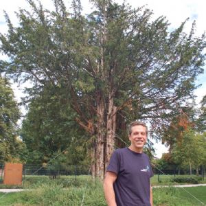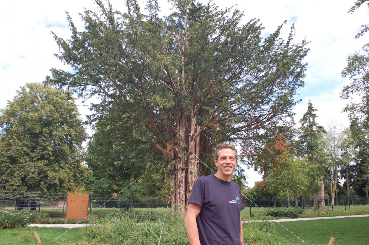 Lars van der Wal bij de zelf verplante oude Taxus: de op één na dikste van Overijssel