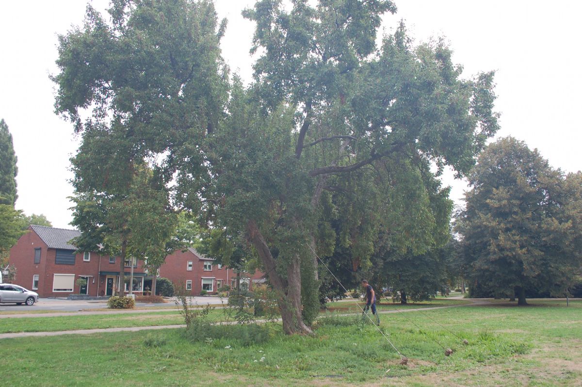 Van der Wal en Konijnenbelt rijden naar een plek in een brede groenstrook waar een 80-jarige Malus hupehensis van zo’n vijftien meter hoog staat, die de Hellendoornse bomenploeg in 2008 zelf heeft verplant. Konijnenbelt: ‘Hij moest weg uit het centrum. We hebben een kluit van vijf bij vijf meter rond gestoken, er met de grondboor gaten onder geboord, er stalen balken onder geschoven, hem met de telekraan rechtstandig op een dieplader gezet en naar zijn nieuwe bestemming gebracht. Dat was een hele operatie. Hij bleek 20 ton te wegen. We begonnen ’s ochtends en waren ’s avonds pas klaar. Ondanks zijn formaat hoefden we hem van tevoren niet te snoeien: hij kon nét onder de lantaarnpalen door.’
