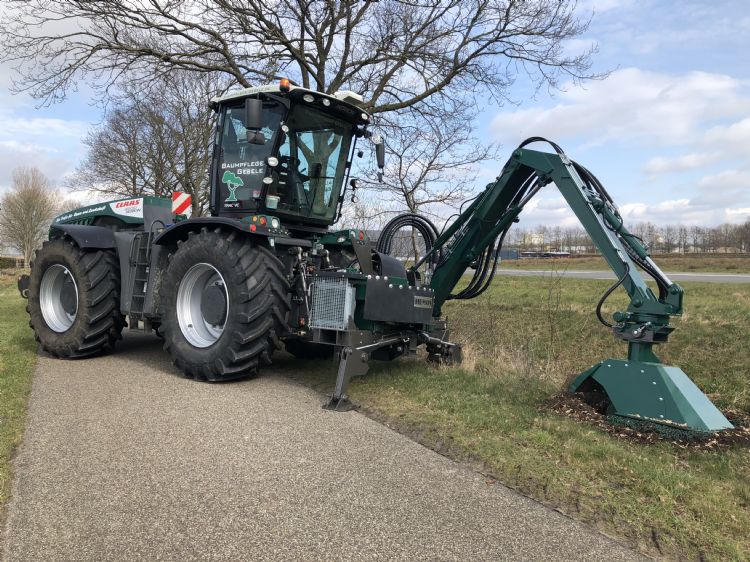Om de bomen bovengronds te verwijderen, schafte het bedrijf onlangs een zwaardere trekker aan, waarvoor een zwaardere stobbenfrees van minstens 400 pk nodig was. KleinJan: ‘Bij het verwijderen van bomen kun je ze rooien en afvoeren of de stobbe uit de grond frezen. Omdat we al sinds 2008 erg tevreden zijn over de stobbenfrees van Hemos, besloten we bij hen een nieuwe, krachtigere variant aan te schaffen met een grotere capaciteit.’ Bruins & Kwast heeft een ploeg vaste machinisten op machines die veel contact onderhouden met Hemos, vertelt KleinJan. Nadat enkele weken geleden in het voortraject een prijs werd opgevraagd, werden details doorgepraat zoals de machinebediening of de aanwezigheid van een fijnfilter. KleinJan: ‘Uiteindelijk krijgen we hem precies zoals we hem willen hebben.’ Foppe Mosterman van Hemos: ‘Ze hebben nu bij ons de krachtigste in de markt besteld. Er is geen enkele stobbenfrees met zoveel hydraulisch vermogen, ook niet mechanisch. De hydraulische giek kan heel wat obstakels overbruggen, zoals een vangrail, een boom of een slootkant. Deze variant is flexibeler en heeft een groter vermogen. Dat maakt het verschil bij grote klussen.’