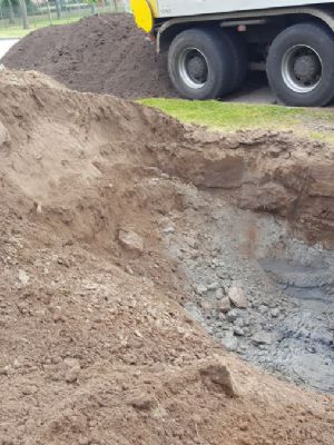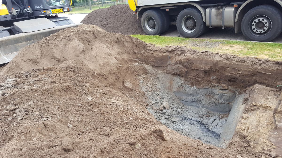 Maar liefst 30 kuub leemlaag werd met een kraan verwijderd.