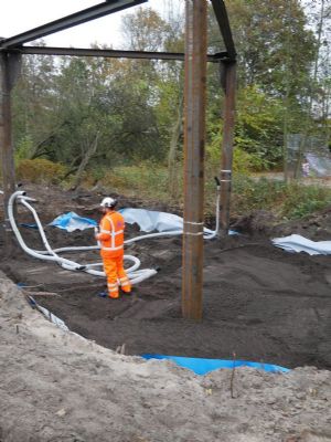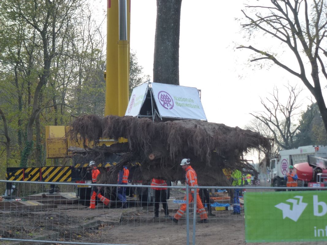 Er is daarom gekozen voor een ‘kluitloze’ verplantmethode. Doornenbal: ‘Deze methode is in Nederland nog nooit toegepast bij het verplanten van bomen. Normaal gesproken maak je een kluit, waarbij je de wortels daarbuiten amputeert. Bij deze manier van verplanten wordt de grond zorgvuldig tussen de wortels vandaan geblazen en gezogen, waardoor het gewicht op de wortels bij de verplanting enorm wordt gereduceerd. Deze methode is wel al eerder succesvol toegepast in de Verenigde Staten, maar niet met dit formaat bomen.’