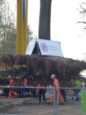 De Nationale Bomenbank deed eerder ervaring op met de ‘kluitloze methode’ bij een innovatief kunstproject dat de afgelopen twee jaar plaatsvond op het voorplein van Van Hall Larenstein in Velp. Een volwassen boom werd drie meter boven de grond geplaatst met wortels zonder aarde, om vervolgens kunstmatig in leven te worden gehouden.