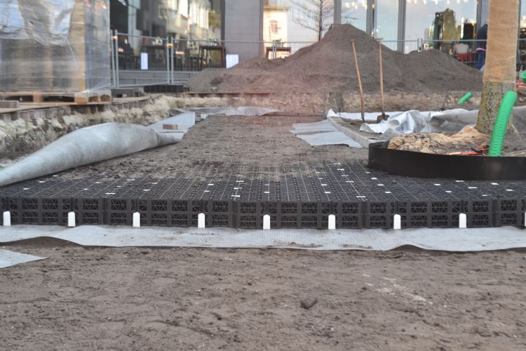 Om aan al deze eisen te voldoen, is er gebruikgemaakt van een combinatie van de drukspreidende methode met de Permavoid® Sandwich Constructie (PSC) en een natuurlijk irrigatiesysteem met het Permavoid® Capillair Irrigatie Systeem (PCIS) van TGS. Deze tot nu toe succesvolle combinatie is uitgebreid met een extra laag PCIS. Hierdoor wordt ruimte gecreëerd om hooswater door piekbuien tijdelijk te bergen en te gebruiken voor de boom of vertraagd af te voeren. Door de ingebouwde capillaire kolommen in de units is het mogelijk om water over maar liefst 30 cm naar boven te transporteren, waar een schijngrondwaterstand in stand wordt gehouden.