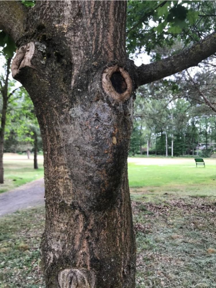 | | #P Er zijn gaten te zien in de gefixeerde, gekrompen nesten. Van Gaalen: ‘Het vermoeden bestaat dat de nesten dienen als voedsel in de ecologische keten. Zodra het nest gefixeerd is en de rups dood, is het gefixeerde nest een natuurlijke habitat voor ande |