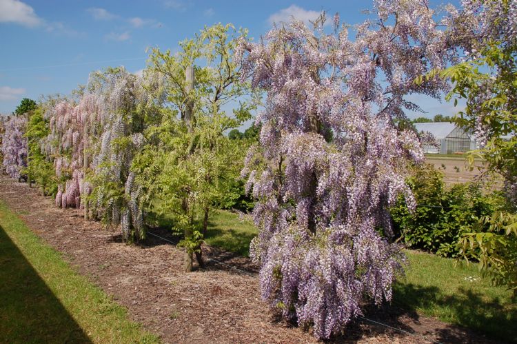Of men de blauweregen nu op een latwerk of op een pergola wil hebben, de eerste stap is om een plantenframe te bouwen met een paar hoofdscheuten als basisstructuur. Deze hoofdscheuten kunnen later worden gebruikt om kortbloeiende scheuten te laten groeien. Zonder deze 'trainingssnede' en het maken van een plantraamwerk vindt ongecontroleerde groei plaats met verweven scheuten en verminderde bloei. Elk jaar worden de steigertakken verlengd; later kunnen er weer bloeiende zijscheuten uit worden gehaald.
