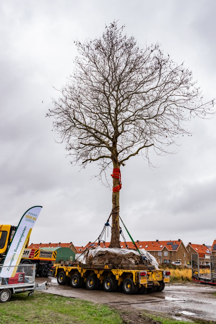 Twee grote platanen, elk zo'n dertig ton van gewicht, stonden in de Eikenhof in De Lier (gemeente Westland). Vanwege rioolvervanging moesten deze weg. Zoontjens: 'Als het gaat om de gemeente Westland, dan heb je het over een gebied met veel glastuinbouw en relatief weinig groen. Dus men is zuinig op het groen dat er is. Daarom wilde de gemeente de bomen behouden en ze verplaatsen naar een nieuwbouwareaal, waar op dat moment nog gestart moest worden met de bouw. Dat terrein lag een kilometer of drie verderop. De bomen zijn geschoord en stapvoets op een platformwagen naar de nieuwe locatie vervoerd.'