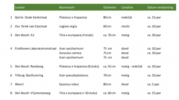 'Ik weet dat er in de provincie Noord-Brabant op diverse locaties grote bomen zijn verplant waarbij dat niet goed is gegaan', zegt Vermeulen. 'Het is echt niet zo dat ik alleen deze slechte voorbeelden noem', verzekert hij. 'Veel andere zijn er eigenlijk ook niet. Anderzijds ken ik ook niet veel geslaagde verplantingen. Dat wil niet zeggen dat ze er niet zijn; er zijn ongetwijfeld ook geslaagde projecten. Al blijft het de vraag of deze bomen hergroeien tot de potentie die ze hadden vóór de verplanting.' In de tabel staan enkele voorbeelden van boomverplantingen waarbij Vermeulen Boomadvies direct of indirect betrokken was.