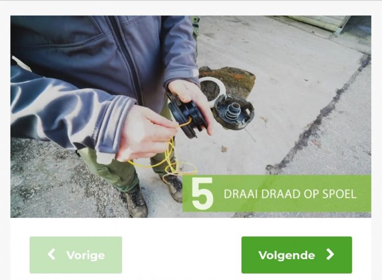 De demo bestaat uit vijf filmpjes. De redacteur van dit vakblad klikt op het filmpje 'Maaikop en bladen verwisselen' en hoort trainer Maud Hoefs vertellen hoe dat in zijn werk gaat: 'Om de maaikop te bevestigen, heb je eigenlijk alleen de kop nodig en een spijker. De spijker kan aan de achterkant in de maaier worden gestoken om de as vast te zetten. Let erop dat de as links van de schroefdraad zit en dat de kop dus naar links gedraaid moet worden om hem vast te zetten. Om hem los te maken, moet je hem naar rechts draaien. Als je aan het maaien bent met de draadkop, moet je de draad ook af en toe vervangen. De gele draad is voor benzinemaaiers, de oranje draad voor elektrische maaiers. Op een kop gaat ongeveer 4,5 meter.'