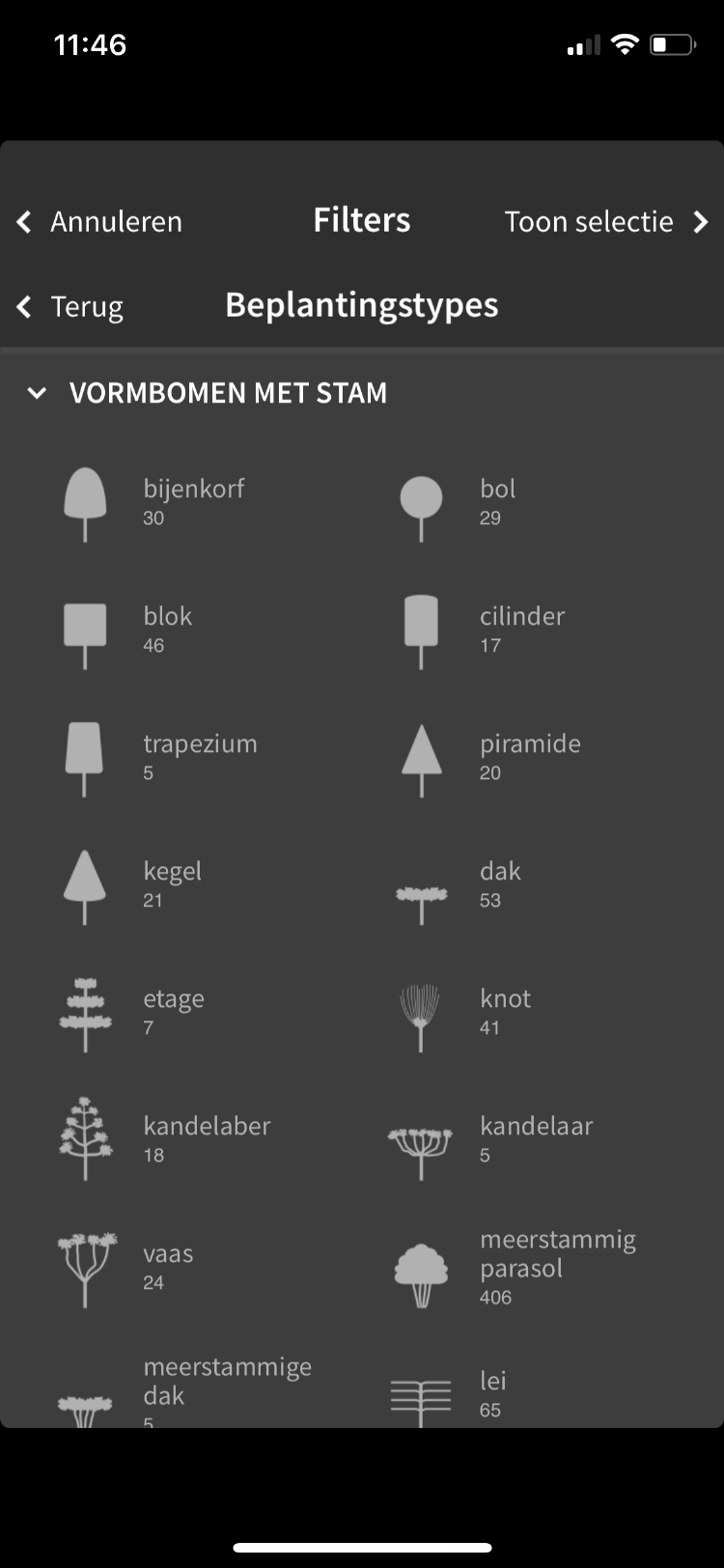 Na de geografische ligging en de toepassing komen de beplantingstypes. Hier wordt gekozen voor een boomtype, al dan niet een meerstammige boom, een bepaalde kroonstructuur of kroonvorm, al dan niet een vormboom, met of zonder stam, en - ook belangrijk - voor de gewenste hoogte of breedte van de beplanting. Na elke keuze kan tussentijds de geselecteerde beplanting worden bekeken.