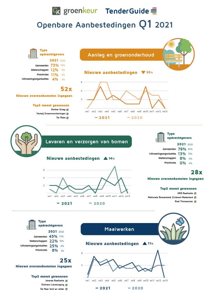 Er zijn in het eerste kwartaal van 2021 52 overeenkomsten vanuit openbare aanbestedingen in uitvoering genomen. Het aantal nieuw aangekondigde openbare aanbestedingen nam met 30% af ten opzichte van 2020. Net als vorig jaar is verreweg het grootste deel van de aanbestedingen afkomstig van gemeenten (73% in 2021, 78% in 2020). Groenkeurondernemers Donker groep, Verheij Groenvoorzieningen en Ter Riele hebben in de eerste kwartaal (Q1) de meeste aanbestedingen gewonnen.