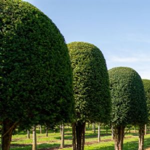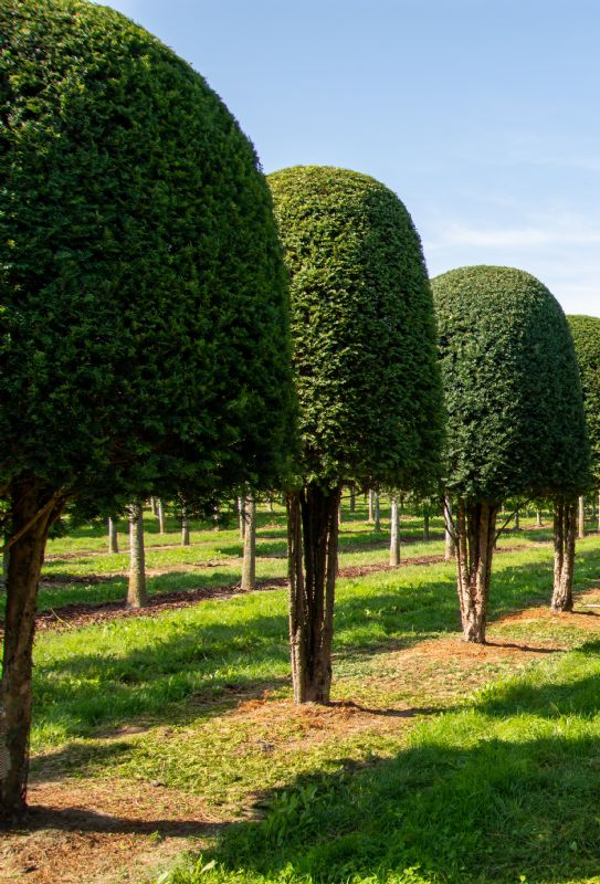 We kennen Taxus baccata vooral als zeer formele toepassing, in de vorm van een strak geknipte heg, of als bolvorm als het een vormboom is. Tegenwoordig zie je ook steeds vaker hoogstam-Taxus als alternatief voor een wintergroene boom. Deze meerstammige Taxus baccata in bijenkorfvorm op stam heeft een losse uitstraling door de meerstammigheid, en tegelijkertijd een gestileerde uitstraling door de bijenkorfvorm erbovenop. Deze meerstammige inheemse wintergroene vormboom is ideaal als je wel een vormboom wilt, maar tegelijk voorstander bent van een natuurlijkere uitstraling. Zeker in grotere aantallen geeft de aanplant van meerstammige Taxus baccata in bijenkorfvorm een speelse indruk. Door de meerstammigheid zijn geen twee bomen hetzelfde.