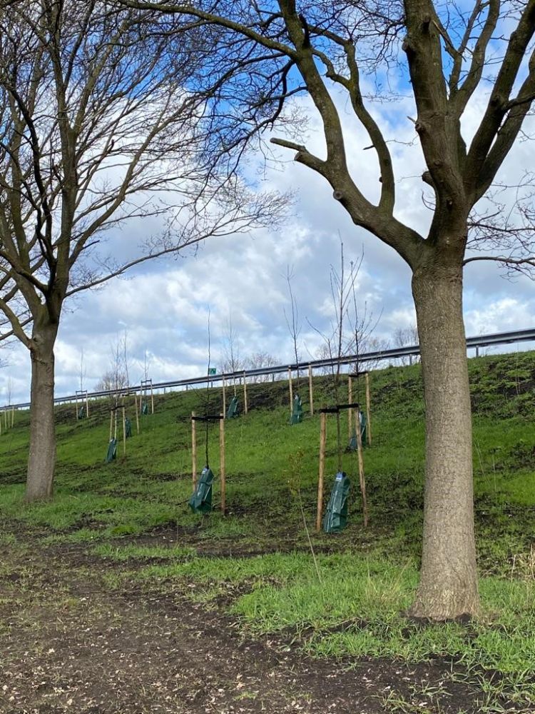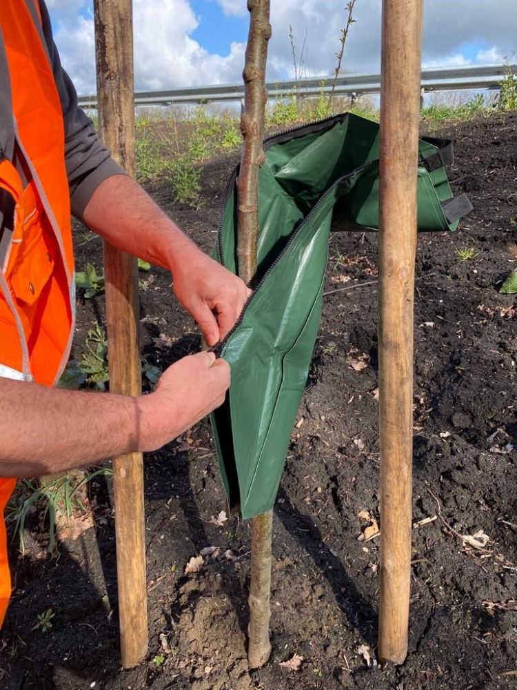De helling langs de snelweg brengt uitdagingen met zich mee voor de jonge aanplant. Door de zwaartekracht verdwijnt het gevallen regenwater vrij snel door de schuine standplaats. Gietranden zijn er niet zomaar te installeren. Voor dit soort situaties ontwikkelde Greenmax de Aquabag, een relatief grote groene druppelzak, waarmee gefaseerd en gericht water rond de stam van de boom wordt toegediend. 'Het is een eenvoudige, betaalbare technologie, waarbij geen ondergronds irrigatiesysteem nodig is', zegt van Pinxteren. 'Ook kun je de zak er zo omheen hangen. Nadat je de Aquabag hebt afgevuld, druppelt het water zes tot tien uur lang langs de stam van de boom. Hierdoor bevorder je diepe wortelgroei.'