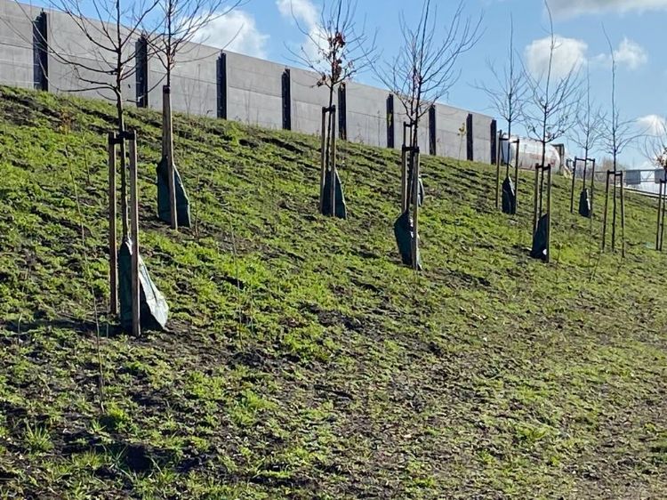 De uitdagende standplaats was voor Heijmans reden om te verkennen hoe aan de waterbehoefte van de jonge aanplant kon worden voldaan. 'Onze keuze viel op Aquabags, omdat delen van de taluds moeilijk begaanbaar en bomen moeilijk bereikbaar zijn voor het geven van water', legt Maarten van Dijck van Heijmans uit. 'De druppelzakken die aan de boom hangen, zijn gevuld met 75 liter water. In totaal worden er 2000 Aquabags opgehangen, en 1000 gietranden geplaatst bij bomen waar dat wel kan. Op die manier krijgen de jonge bomen voldoende water om goed te kunnen groeien.'