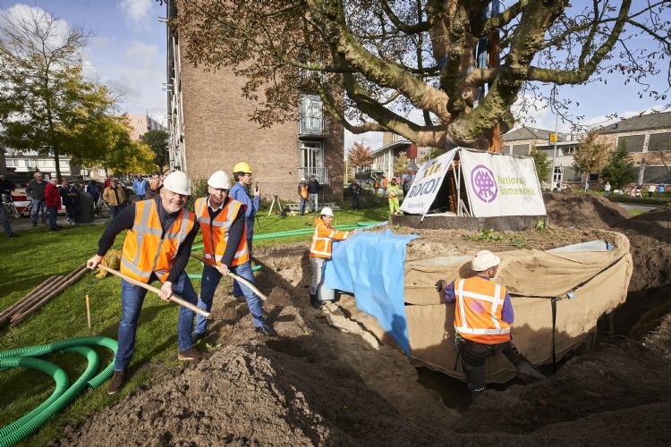 | Na de plaatsing van de boom in het nieuwe plantgat schepten wethouder Gert-Jan Schotanus en Jan Bouter van Bogor Projectontwikkeling de eerste grond bij de boom. |