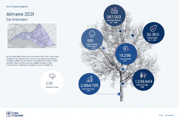 | | We zien interessante verschillen tussen een oudere en een nieuwe wijk. In het overzicht is te zien dat de eco-impact van de oudere bomen in de Grienden bijna twee keer zo hoog is dan die van de jongere bomen in de Nobelhorst. |
