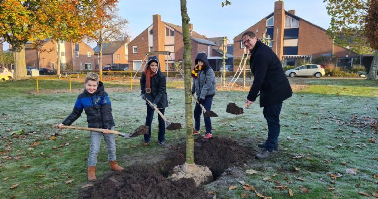 | Wethouder Paul Sanders plant een boom in Baarlo met leerlingen van De Diamant. |