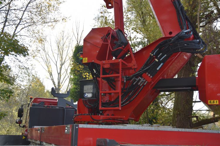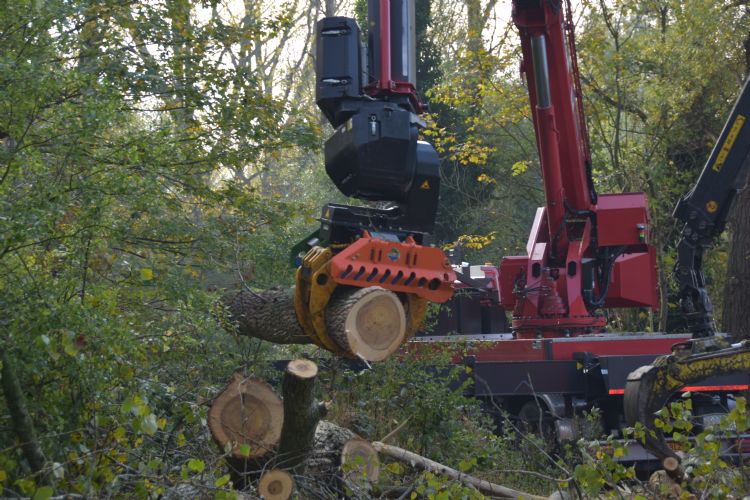 Het is een genoegen om te zien hoe behoedzaam de machinist vanaf de grond al sturend met zijn afstandsbediening soms grote stamdelen uit de boom haalt. Zie hiervoor deze Youtube-video: <<>> Dit gebeurt bijna zonder schokken, dankzij de proportionele bediening van de vele cilinders, en zonder bomen in de nabijheid te beschadigen. Eenmaal is duidelijk te zien dat het enorme koppel van 6.000 Nm - dat de grijper veilig aankan - een groot voordeel is. De grijper legt een groot stuk stam van ruim 4 m op de grond. Deze stam wordt niet in het midden vastgehouden, maar op circa een vierde van het uiteinde. Zonder een krimp te geven en zonder te kiepen, komt het stamdeel keurig horizontaal op de rijplaten te liggen. De giek van de containerwagen pakt de stam echter wel in het midden vast. De bediener legt hem keurig op de houtstapel, die bestemd is voor de houtverwerkende industrie. Weijtmans wijst op nog een ander aspect van veilig, efficiënt en schoon werken: 'Aan de giek waarmee we de houtcontainer vullen, zit een Selfridge-knijpbak, die we met platen dichtgelast hebben. Met zijn geopende bek van circa 120 cm schuiven we nu alle korte stukken hout en blad op één hoop, om die vervolgens in de gereedstaande container te laden.' Ondertussen schuift de giek van de velkraan in elkaar en vouwt de hydrauliek de velkop ineen, voor het transport naar de volgende klus.