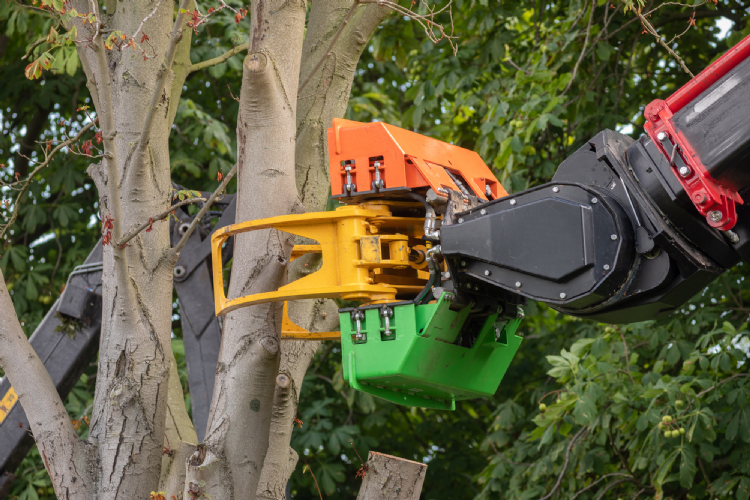De operator houdt de net afgezaagde top behoedzaam en veilig in bedwang.