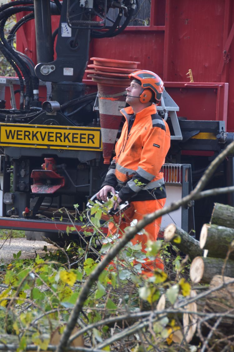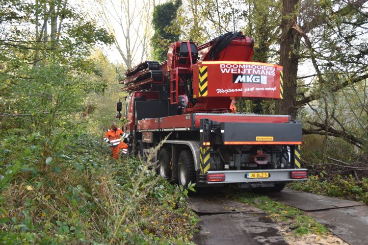 Het is opvallend dat de kraanwagen niet verreden wordt tijdens de rooiwerkzaamheden. De man met de afstandsbediening staat dicht bij de kraanvrachtauto met container en houdt overzicht. Alle drie medewerkers staan via een headset constant met elkaar in contact. Overduidelijk werken ze bij Weijtmans veilig. Als de kettingzaag ronkt voor het verwijderen van zijtakken om ze hanteerbaar te maken voor het opladen, bewegen de twee gieken nauwelijks. Je ziet dat Weijtmans geniet van deze manier van werken: 'Veiligheid staat bij ons op nummer één. En niet alleen op de werkplek', zegt hij. 'Nevenschade en sporen om de werkplek te bereiken willen we voorkomen. Daarvoor leggen we dan, zoals nu, eerst rijplaten neer. Bij zo'n project oriënteren we ons eerst op de voorzieningen, de bereikbaarheid en de verkeers- en parkeeromstandigheden. Vaak gaat er een bewonersbrief uit in samenwerking met de opdrachtgever en we stemmen het werk af op schooltijden en vakanties. Soms leidt dat tot een compleet veiligheidsplan bij projecten als deze. Veilig werken is een prioriteit voor ons; voor onze eigen mensen is dit ook een belangrijke competentie. Ze willen immers 's avonds ook weer heelhuids thuiskomen. Het gevoel rondom veiligheid moet goed zijn. Als iemand daar geen goed gevoel bij heeft op enig moment voor of tijdens het werk, moet hij het werk stilleggen en hierover bellen met de projectleider.'