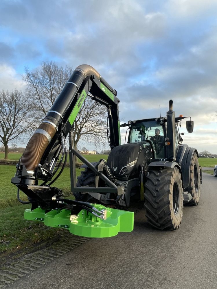 Mosterman vertelt: 'Inmiddels hebben we twee takkenslagmaaiers geleverd: één aan Provaas in Schimmert en een aan de eerder genoemde Veenstra in Nijensleek. Beide machines hebben drie rotors en dat brengt de werkbreedte op ongeveer 2,2 meter. Bij Veenstra is de takkenslagmaaier bevestigd aan onze zogenoemde 'overrijdchassisaanbouw' (Orca). Dit gaat om een hydraulische giekaanbouw van Hemos met een snelwisselsysteem. De driedelige giek heeft een bereik tot 8 meter en is geschikt om er werktuigen aan te monteren zoals maaiers, slootreinigers en frezen. Deze giekaanbouw kan binnen vijf tot tien minuten aan vrijwel elk type tractor worden bevestigd, door over het chassis heen te rijden en het snelwisselsysteem aan te koppelen. Alle hydrauliekslangen zijn weggewerkt in het frame, zodat de bestuurder goed zicht houdt. Met deze giek kun je zowel over links als over rechts werken. Voor degenen die vaak over links werken, is er zelfs een motorkapbeveiliging beschikbaar. Tijdens transport klapt de giek naar achteren; daarmee blijft hij onder de maximale transporthoogte.'