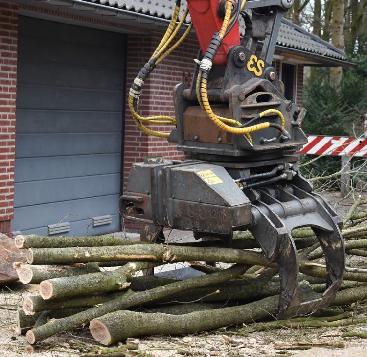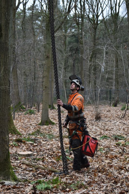Vanwege de slechte bereikbaarheid van de te kappen bomen kon er niet zomaar een hoogwerker worden ingezet. 'De situatie was complex, maar met de juiste vakmensen en machines konden we deze klus klaren. We gebruikten een soort telescoopkraan. We konden hier niet werken met een automatische zaagkop, omdat we een boom van bovenaf moesten benaderen. Van onderaf was niet mogelijk; er stonden teveel bomen omheen die moesten blijven staan. Onze ETW-er hing aan een lijn aan de telescoopkraan en maakte vandaaruit de boom van bovenaf vast. Vervolgens werd de boom aan de onderkant doorgezaagd en over de andere bomen heen getild, naar een plaats waar we hem konden laten zakken. Daar werd hij in stukken gezaagd en afgevoerd.'