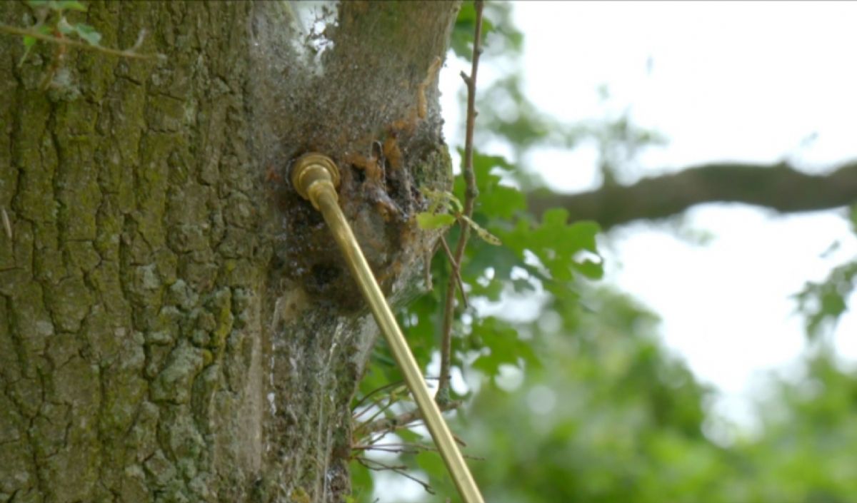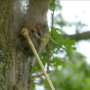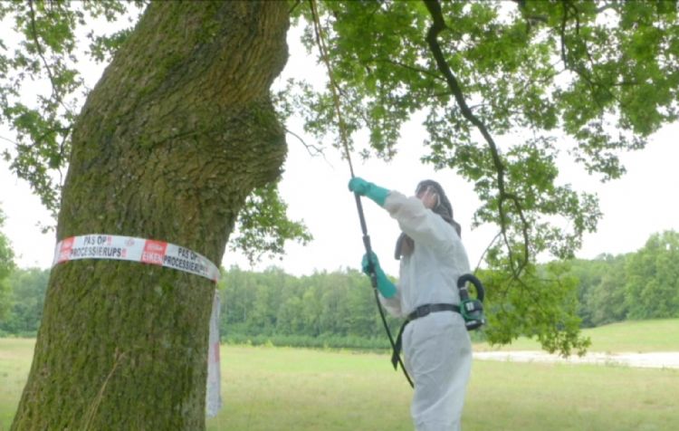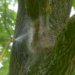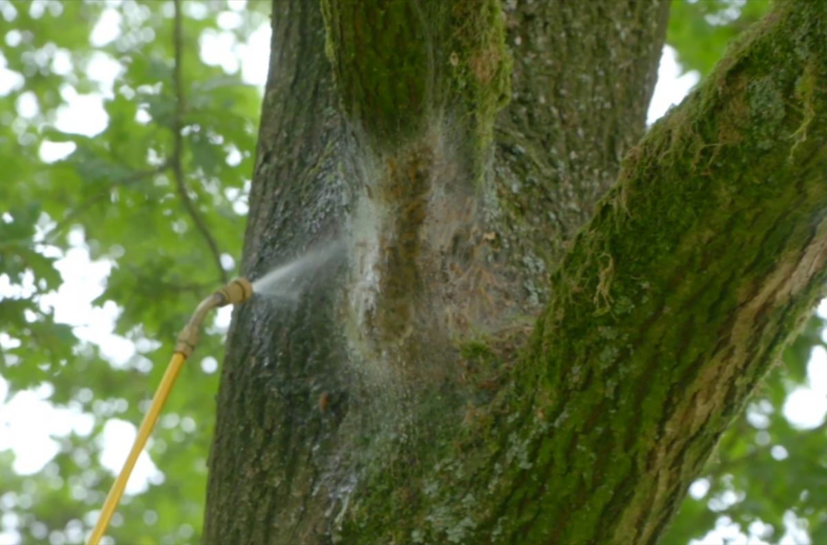 De Groot: 'Bij een grote hoeveelheid eiken met nesten voeren wij de werkzaamheden met Rufix met een hoogwerker uit. Dat werkt heel efficiënt vanwege de snelheid; we kunnen zo veel nesten per uur behandelen. Het scheelt in de kosten dat we geen stofzuiger en aggregaat nodig hebben en geen afval hoeven op te vangen en af te voeren. We hebben alleen een vrij simpele spuit-unit nodig.' De Groot denkt dat het werken met Rufix voor de persoon in de hoogwerker prettiger is dan het wegzuigen van nesten, omdat het minder zwaar is.