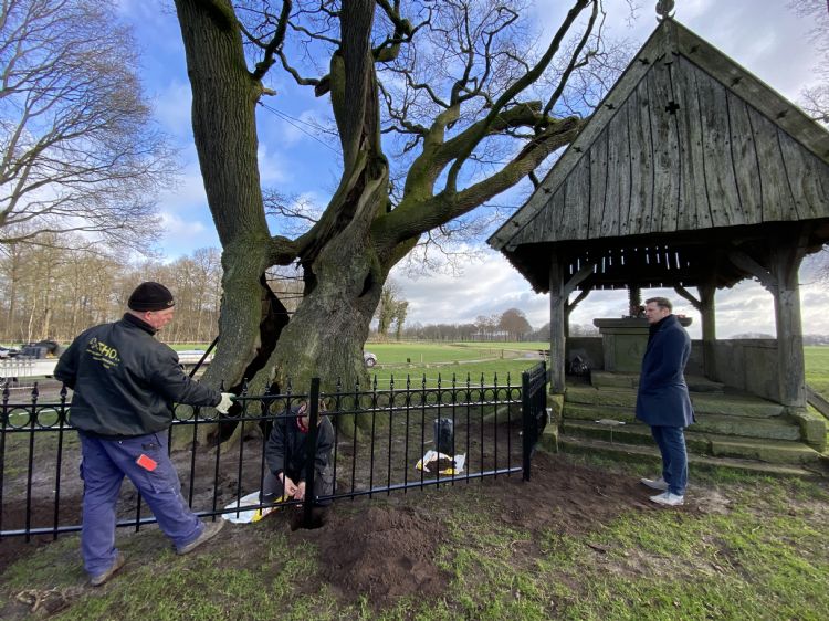Het aanbrengen van het hekwerk is het slotstuk van een grote onderhoudsbeurt voor deze indrukwekkende bejaarde boom, op initiatief en op kosten van de gemeente Tubbergen. Het gietijzeren hek met spijlen moet voorkomen dat mensen de boom aanraken en erin klimmen.