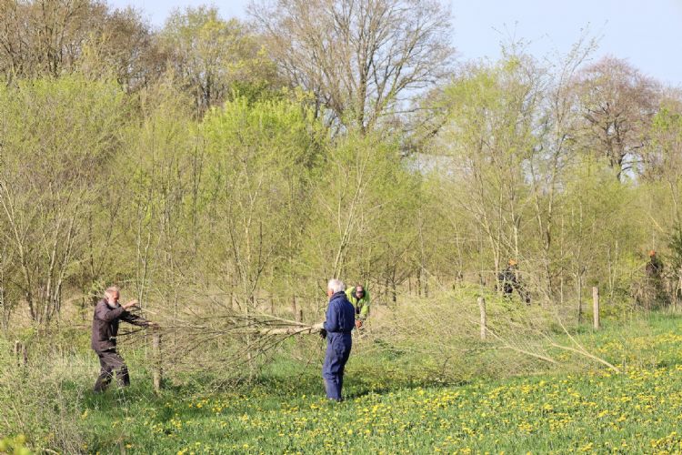 Vrijwilligers uit Zalk, die op verzoek van Lodewijk van Kemenade in april ruim honderd bloeiende Siberische iepen hebben gezaagd en verwijderd uit het bos
