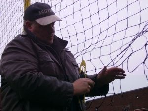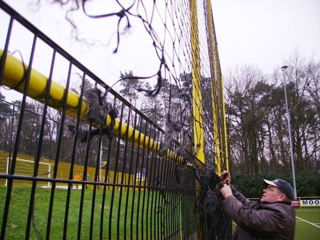 Het lijkt bijna niet meer van deze tijd, maar voor voetbalnetten en ballenvangers is repareren nog steeds veel goedkoper dan nieuw kopen. Alleen wie beheerst dat oude ambacht nog. Jaap van der Bent uit Katwijk aan zee is een van de weinigen die nog weet hoe dat moet. En heeft dat natuurlijk niet in sportveldenmarkt geleerd, maar gedurende zijn werk als visser. Jaap van der Bent wil zich nu nog nadrukkelijker storten op de sportmarkt. Een initiatief dat wij alleen maar kunnen toejuichen. Want repareren is niet alleen goedkoper, maar ook veel sympathieker. Jaap van der Bent: "Ik ben goedkoper omdat je geen nieuw net of ballenvanger hoeft te kopen, maar ook omdat je de kapotte netten niet af hoeft te halen en dat scheelt ook weer een paar uur werk. Van der Bent werkt al voor de nodige gemeentes. Voorbeelden daarvan zijn Rotterdam, Nijmegen, Alphen aan den Rijn en Amsterdam. Een van de klanten van Van der Bent is Johnny Smeeman, senior beheerder buitensport van Nijmegen. Volgens Smeeman kost het vervangen van een ballenvanger € 500. Als je dat afzet tegen repareren a € 40 per uur is de som zo gemaakt. Natuurlijk kunnen we niet eindeloos repareren maar het levert wel een flinke besparing op. En niet alleen in de kosten van de netten; denk ook aan de arbeidstijd die nodig is om de netten te demonteren en daarna weer te monteren.