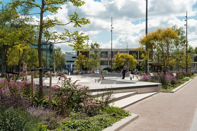 Skatersparadijs, uitgaansgebied, looproute naar het station, park, waterbouwkundig kunststukje: het Industrieplein in het Overijsselse Hengelo is het allemaal. 'De dynamiek op dit plein is gigantisch', zegt Peter Lubbers van Buro Lubbers. Lubbers maakte het ontwerp voor het nieuwe plein waarvan nu vooral de naam nog verwijst naar de vroegere industriële bestemming.