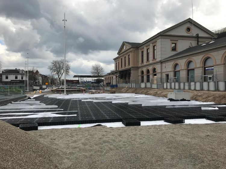 In totaal ligt onder het Stationsplein bijna 2000 vierkante meter aan kratten, met een waterbufferingscapaciteit van rond de 275 kubieke meter. 'Daarmee kun je wel een flinke bui opvangen en kunnen de bomen en heesters het in een droge periode lang uitzingen zonder extra water. 'In de groeiplaatsen boven het waterabsorptiesysteem moet een geschikt bomensubstraat gebruikt worden. Ook hiervoor tekende Heicom. Hier is Boomgranulaat ECO HBB gebruikt, dat bestaat uit gerecycled breuksteen en geschikt is voor groeiplaatsen onder verharding. Het voedingsdeel van dit bomengranulaat is een uitgekiende combinatie van klei, organische stof, extra meststoffen en Broadleaf voor extra waterbuffering. Het heeft een hoog organisch stofgehalte en een goede zuurgraad.'