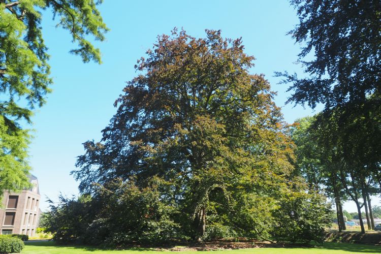 Een rode monumentale beuk van 32 meter hoog die geplant is bij een klooster. Verder is de natuur zijn gang gegaan. De takken hangen tot aan de grond, wortelen zich en ontwikkelen tot nieuwe bomen. Hij heeft een enorm kroonoppervlak van wel 804 vierkante meter. Een echte ecologische parel.