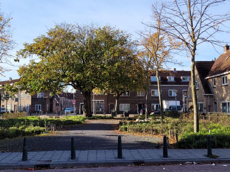 In de oude situatie stond er een monumentale vleugelnoot en tien overige bomen waaronder lindes, esdoorns en een kleine vleugelnoot. Door bewust te kijken naar de te leveren ecosysteemdiensten, is besloten om vier bomen te verplanten naar een straat verderop in de wijk en de te handhaven zeven bomen te voorzien van 20 kuub Haags bomenzand per boom. Het gaat om de juiste boom op de juiste plek en de juiste aantallen. Enkele bomen die elkaar in de weg zaten zijn verplant, maar daardoor krijgen andere bomen meer wortelruimte, wat in het kroonvolume en de te leveren ecosysteemdiensten terug te zien zal zijn. Door de bomen te verplanten in plaats van te rooien, blijven de bijdragen aan ecosysteemdiensten stijgen, ook al is het duurder in de uitvoering. 'We hebben gezorgd voor meer groeipotentie voor het bomenbestand,' vervolgt Schuurkamp. 'Met de vergroening van het plein probeert de gemeente niet alleen fysieke zaken als klimaatadaptatie en waterregulering te bereiken, maar ook door de stijgende sociale cohesie het gevoel van onveiligheid af te laten nemen en daarmee de leefomgeving van bewoners te verbeteren.'