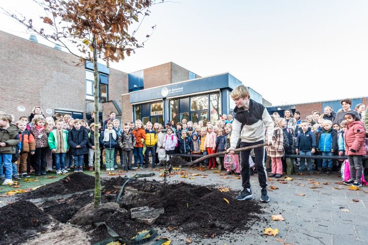 | Onder toeziend oog van de hele school werd de boom geplaatst door de kinderen uit de leerlingenraad. Ronald van den Brink van Bomenwacht Nederland gaf uitleg over de groeiplaats en de boom. |
