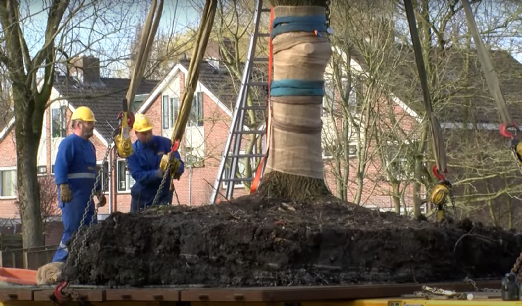 Boom die in de weg stond bij bouwproject wordt prominente pleinboom
