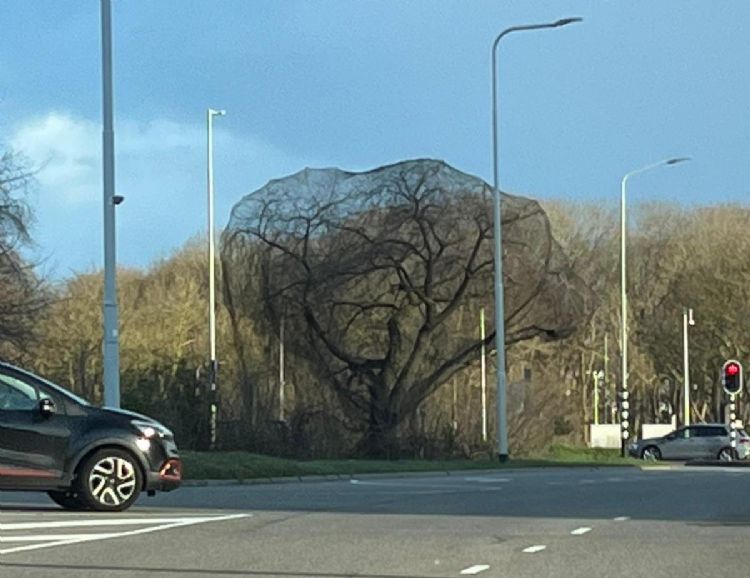 Opeens is-ie er weer Terug van heel lang weg geweest: raad-je-plaatje. Rijdend door onze stad passeerden we deze boom, ingepakt in een net. Het is geen kersenboom en het is trouwens ook niet het seizoen om gulzige vogels weg te houden bij de rijpe vruchten. Wat is er wel aan de hand?