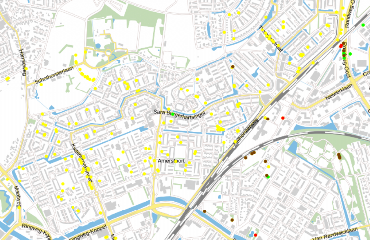 | Detail uit de Amersfoortse bomenkaart: geel = in onderzoek, groen = herplant, bruin = nieuwe boom, rood = geen herplant |
