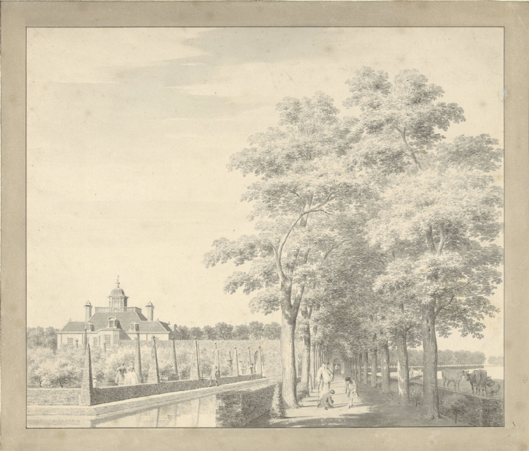 | Tekening uit 1750 van Cornelis Pronk: Huis Spieringshoek bij Schiedam met grote bomen langs de singel |