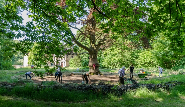 | Vrijwilligers aan het werk onder de veteraanboom in Heusden |