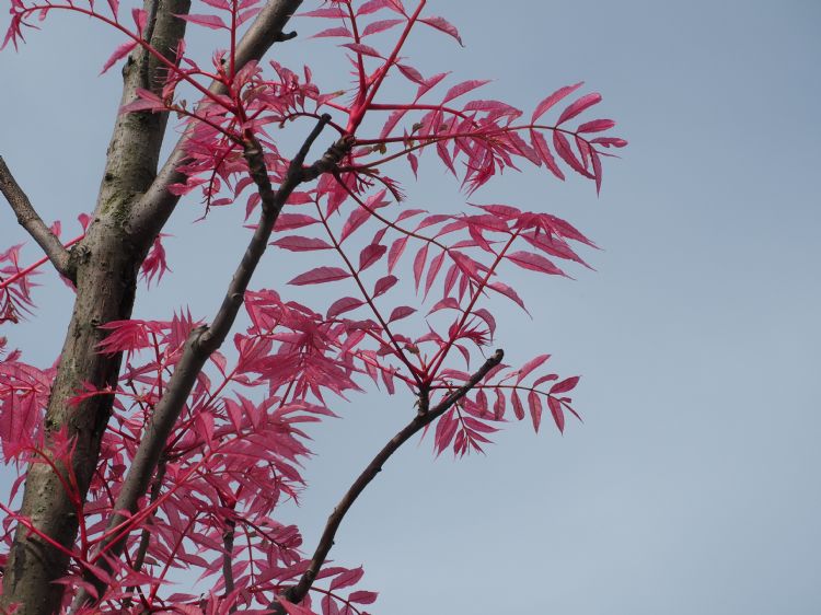 Chinese mahonieboom 'Flamingo', heel apart: loopt echt felroze uit, zoals de naam zegt, zoals de kleur van een flamingo. Parkboom tot 16 meter hoog, met grove vertakking met dikke, grijze twijgen en stam met in de lengte grof gescheurde schors. De bladeren hebben een witte rand en zijn gevlekt, jonge bladeren zachtroze getint. Bloeit met 50-70 centimeter lange, hangende trossen met talrijke kleine, witte tot groenwitte bloemen. Een exclusieve solitair. Werd tot nu toe weinig gekweekt, maar er is nu meer van in productie, ook als meerstam. Groeit redelijk snel in omtrekgroei.