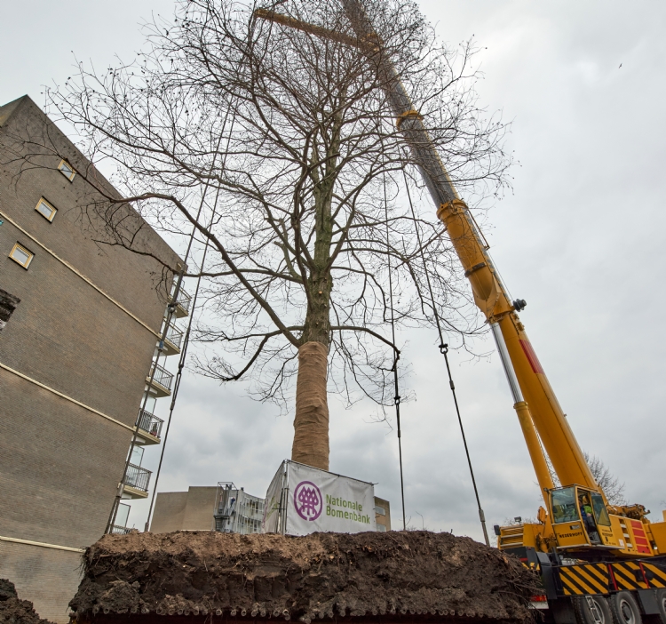 Accountmanager Laurens Lingen: 'De bedoeling van de verplanting is dat de boom zijn waarde behoudt, dus met behoud van het kroonvolume. Dat moet je goed voorbereiden. Niet alleen bij de boom zelf, maar ook bij alle andere onderdelen van het aspect. Zo bepalen we vooraf de plantmethode en berekenen we het gewicht van de boom, zodat we kunnen beoordelen welk type hijskraan nodig is en of er op het terrein voldoende ruimte is. Al het ingezette materieel moet wel kunnen manoeuvreren. Ook voeren we ter plekke een bodemonderzoek uit, bepalen we wat de kluitomvang moet zijn en wat de grondwaterstand is. Zo ontstaan er achteraf ook geen verassingen meer.' Gezien het formaat en gewicht van de boom koos Nationale Bomenbank voor de kluitondersteunende palletmethode. Door horizontaal te heien ontstaat er ruimte onder de kluit waarin metalen buizen worden geschoven. Zo ontstaat als het ware een pallet of plateau onder de hele breedte van de kluit en wordt de boom uit de standplaats gehesen, staande op de pallet. Hiermee wordt voorkomen dat de kluit of delen van de kluit afbreken. Een reële mogelijkheid wanneer een te zware boom aan de stam wordt opgehesen.