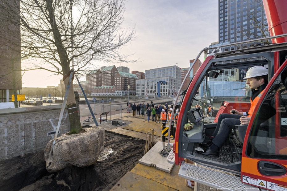 | Wethouder Vincent Karremans (Handhaving, Buitenruimte en Mobiliteit) zet de boom op zijn plek. Foto: gemeente Rotterdam - David Rozing |