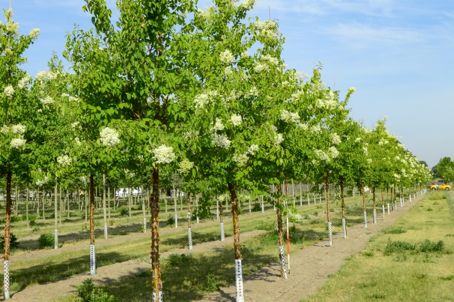 Boomvormende seringenOok bij de seringen ben ik enthousiast over de boomvormers. Net als bij de ligusters, denkt iedereen aan heesters. Totdat je verrast wordt door de grootte, vorm en (ook hier) een late en daardoor opvallende bloei. Het gaat om Syringa reticulata en om Syringa pekinensis. Op het onvolprezen www.treesandshrubsonline.org/ is de laatste inmiddels een ondersoort en wordt deze genoemd als Syringa reticulata subspecies pekinensis. Ik hou hier de Naamlijst houtige gewassen aan. Dat is voor Nederland de standaard.Ook bij de sering gaat het om een kleinblijvende boomsoort: met een meter of acht is deze een prima vervanger voor de eeuwige meidoorn of prunus. Meestal zijn het opgaande bomen met een ronde en soms ovale kroonvorm. Er zijn vormen met een treurende habitus. Die boomsoort (subspecies pendula) gaat slingerend omhoog en maakt dan breed afhangende takken. Hij is in Nederland aanwezig, maar ik heb nooit een groot exemplaar gezien. Wie plant 'm in een park? De grootte van de bladeren is sterk afhankelijk van de selectie. Het exemplaar in Trompenburg heeft bladeren van maar een paar centimeter (zie foto). De kleur van de bloemen ligt ergens tussen crèmewit en geel in. De geur van de bloemen doet denken aan die van een liguster. En ook de sering bloeit lekker laat. Het is dan een feestmaal voor heel veel insectensoorten. Sommige selecties hebben een fraai afschilferende bast, zoals een Prunus serrula die heeft. Andere selecties zijn weer gladder en doen meer denken aan de stam van Prunus avium. Recentelijk bleek bij een jonge aanplant dat ook seringen gevoelig zijn voor zonnebrand op de stam. Een bescherming in de vorm van wit verven of een kokos- of rietmat rondom de stam voorkomt dat de bast heel veel moet verdampen om de stam te koelen juist op het moment dat de boom zijn wortels van de kwekerij mist. Overigens moeten deze seringen in een goed ontwaterende groeiplaats groeien. Zware klei is niet geschikt, maar een hoge pH is prima. Deze seringen stammen uit een landklimaat. Dat is gunstig, want in de hete, droge zomers die we hier gemiddeld meer gaan krijgen, passen deze bomen prima. Voorlopig zit daar een nadeel aan voor het oosten en zuiden van Nederland: doordat het daar in het vroege voorjaar eerder opwarmt, lopen de knoppen eerder uit. Goed verkrijgbaarAlle bomen die ik in lijsten of dit soort artikelen plaats, zijn in Nederland verkrijgbaar. Tenzij anders vermeld. Soms moet je even zoeken of genoegen nemen met een kleinere of juist grotere maat. Een kweker die het heeft over een 'Jaap Smit-boom' die niet te vinden is, moet zijn huiswerk overdoen. Of mij bellen.Overigens zijn ook van de genoemde seringen meerstammen en hoogstammen verkrijgbaar.