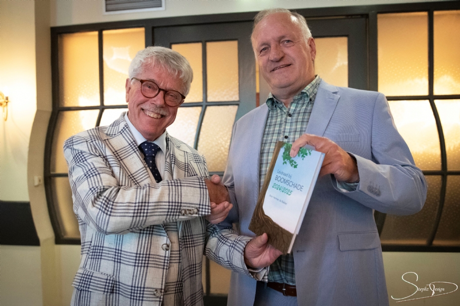 Mr Frank Visser ontvangt eerste exemplaar boek Leidraad bij Boomschade |