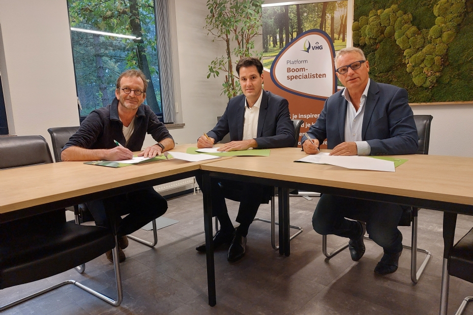 | V.l.n.r.: Willem van Delft, directeur Praktijk Centrum Bomen, Marc van Rosmalen, directeur Koninklijke VHG, Johan van Apeldoorn, directeur IPC Groene Ruimte |