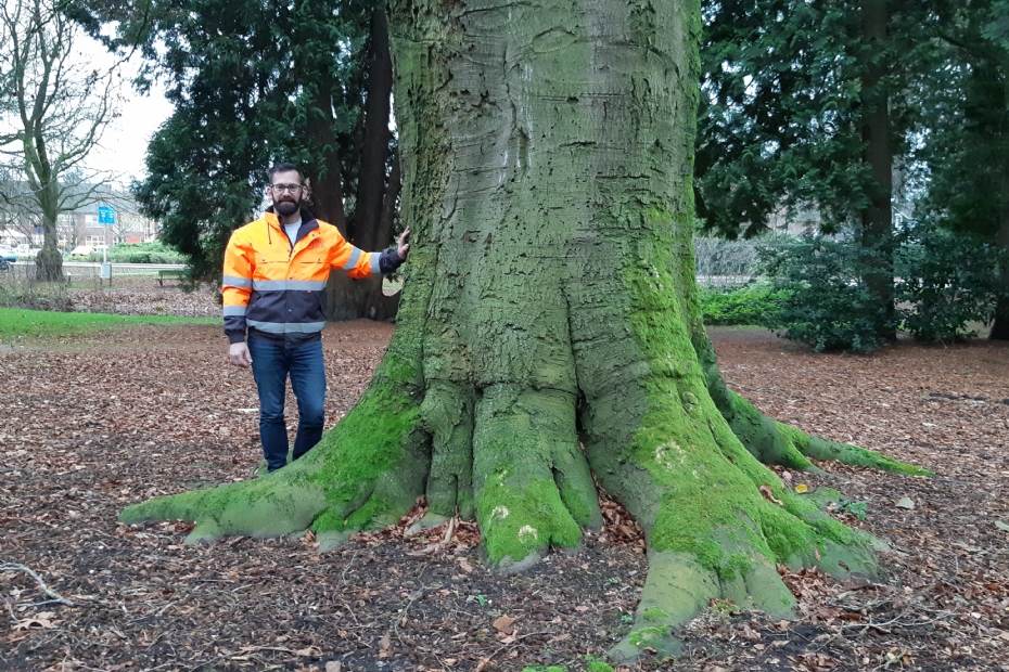 | Dennis Raamsteeboers bij een van de monumentale beuken in park Ruimzicht |