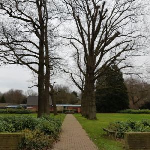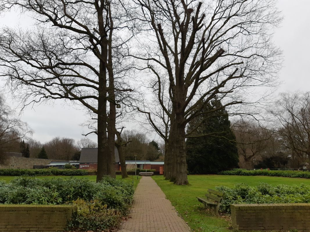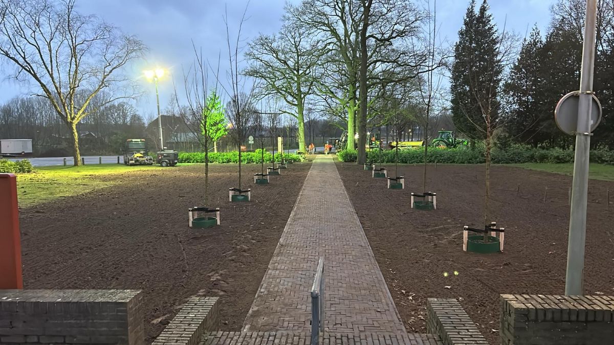 We arriveren bij begraafplaats Slangenburg, waar een vijftal Amerikaanse eiken bij de entree op de nominatie staat om gekapt te worden. 'Deze eiken gaan al een hele tijd achteruit en zijn dan ook flink teruggesnoeid. Ze worden komende week gekapt en dan vervangen door acacia's in twee soorten, die ook meer gaan bijdragen aan de biodiversiteit. Juist op deze plek is het belangrijk om goed te communiceren en tijdens de werkzaamheden rekening te houden met de mensen die hier komen. Ook het informatiebord bij de bomen helpt bij de acceptatie dat deze bomen hier weg moeten. Naast dit soort communicatie werken we graag samen met inwoners, maar hebben bijvoorbeeld ook meerdere malen per jaar overleg met de Achterhoekse Bomenstichting. Zij brengen veel expertise en kennis van het bomenbestand mee. Ook maken zij zich sterk voor het behoud van bomen, vooral de grote, oude exemplaren.'