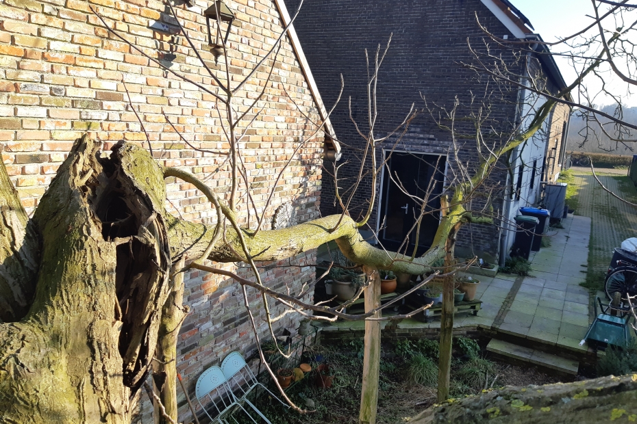 'Samen met de bewoners besloten we deze tak in stand te houden. Gelukkig was daar ruimte voor in deze tuin. We hebben het gedaan door hem iets uit te lichten en te stutten met drie stevige takken, die door de bewoners zelf als pilaren in de grond werden gezet. De schuur ernaast was destijds in verval, maar is inmiddels weer netjes opgebouwd. Dat scheelt aanzienlijk in de windbelasting, zoals je kunt zien. De scheur ziet er momenteel hartstikke goed uit; hij is droog en rot niet in. Wie weet vormt hij inmiddels een mooie schuilplaats voor andere boombewoners.'