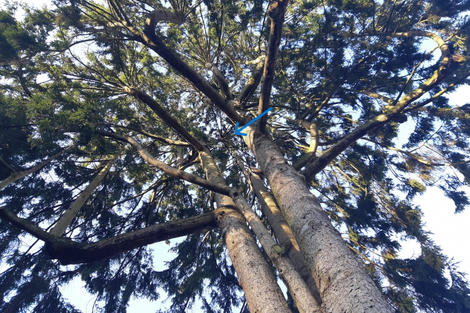 'Wat dit geval bijzonder maakt, is dat de eigenaar deze boom koste wat het kost wil behouden', vertelt Spauwen. 'Maar liever wel zonder het risico dat er takken op de woning vallen. Daarom controleren we deze fijnspar jaarlijks. We zagen dat in de zijtakken nieuwe scheuren waren ontstaan, wat ook wel logisch is als je ziet hoe ze aan de stam vastzitten. Als je de getopte stammen van bovenaf bekijkt, zie je dat het kernhout grotendeels is vergaan - alsof je in diepe emmers kijkt. En uit die dunne restwanden groeien dan weer deze grote zijtakken. Het is eigenlijk verbazingwekkend dat dat überhaupt mogelijk is.'